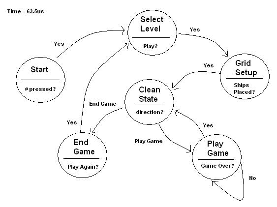In the Debounce state several things happen depending on the state of the “Game Machine”. First off though, we check to see if the button being pressed at that instant is the same as the value stored in lastbutnum. If it is, we execute commands in the Debounce state, if not, we go back to Pushed state. In the Debounce state, if the “Game Machine” is in the Start state and the # key is pressed, we will move onto the SelectLevel state. If we are in the SelectLevel state and the key pressed is a 0 or 1, then the level of the game will be set to easy or difficult and we move on to the GridSetup state. If we are in the GridSetup state, then pressing a 2, 4, 6 or 8 will move the starting position of the ship in a desired direction. If a 0 or 1 is pressed in this state, then we call a function that takes in several pieces of information and places the ship horizontally or vertically on the grid. Once all the ships have been allocated, if we are still in the GridSetup state, then pressing the # key will move the “Game Machine” to the PlayGame state. If we are in the PlayGame state, then any buttons pressed between 0 and 10 will indicate the coordinates that the player wants to shoot at. This is where we also call the function that determines whether the player hit the computers ship or not. If we are in the EndGame state, and the # key is pressed, then we will go back to the SelectLevel state. At the end of the Debounce state, we go to the Detect state.