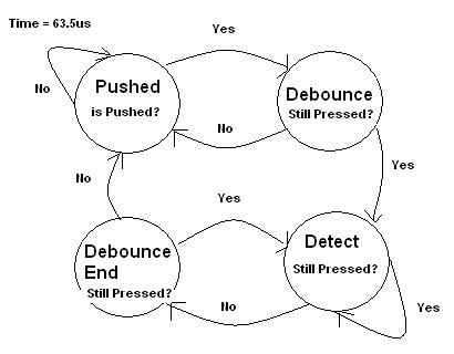In the DebouncedEnd state, if the key being pressed is the same as lastbutnum, we back to the Detect state. Otherwise we go back to the Pushed state and wait for another keypad input.