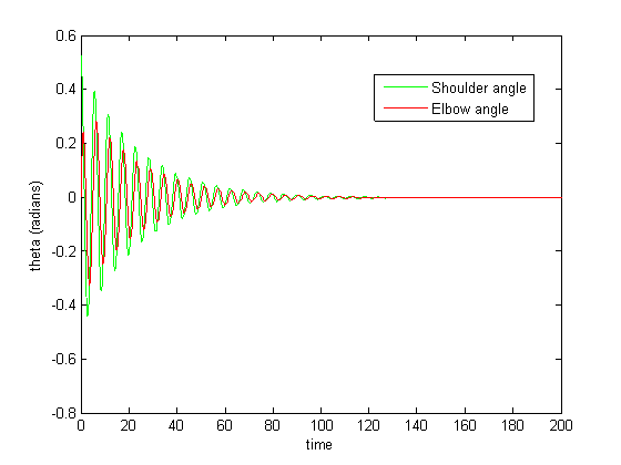 Because the dynamics of the physical model are complex, this model was tested in standalone before addition of the CPG’s. Figure 4 shows one such test, in which the double pendulum was released with no initial velocity. As expected of a damped oscillator (note that both joints were damped), the system’s motion eventually ceases.