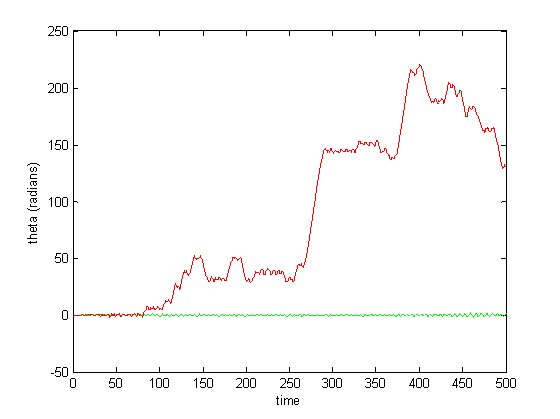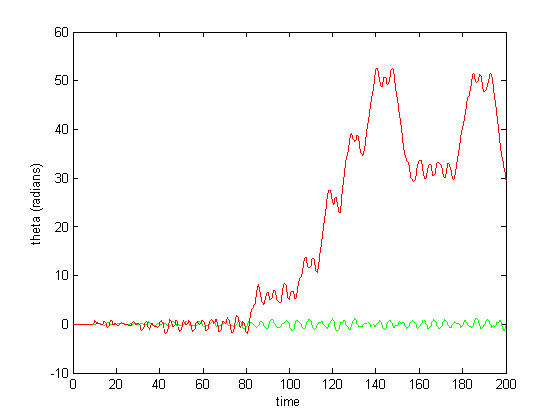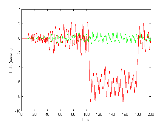 Figure 6-8 show incredibly huge (not to mention physically impossible) position values for the two rods of the double pendulum. I quickly found that this could be remedied by decreasing the gain (Iwasaki and Zheng witnessed entrainment for gain~1). However, the decreased gain resulted in still other problems—radical shift patterns like that of Figure10 were observed at low gain values.