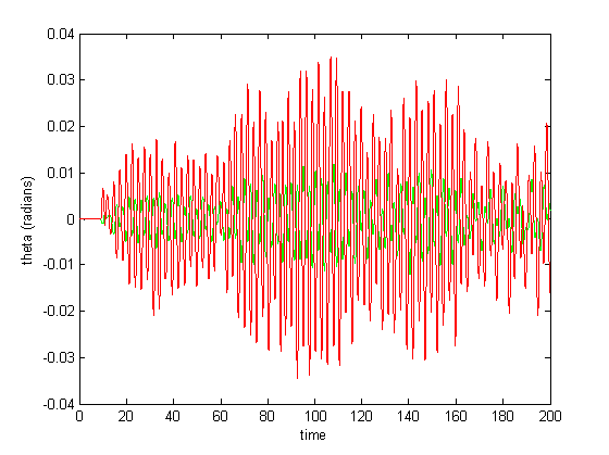 xlabel('time'); ylabel('theta (radians)')