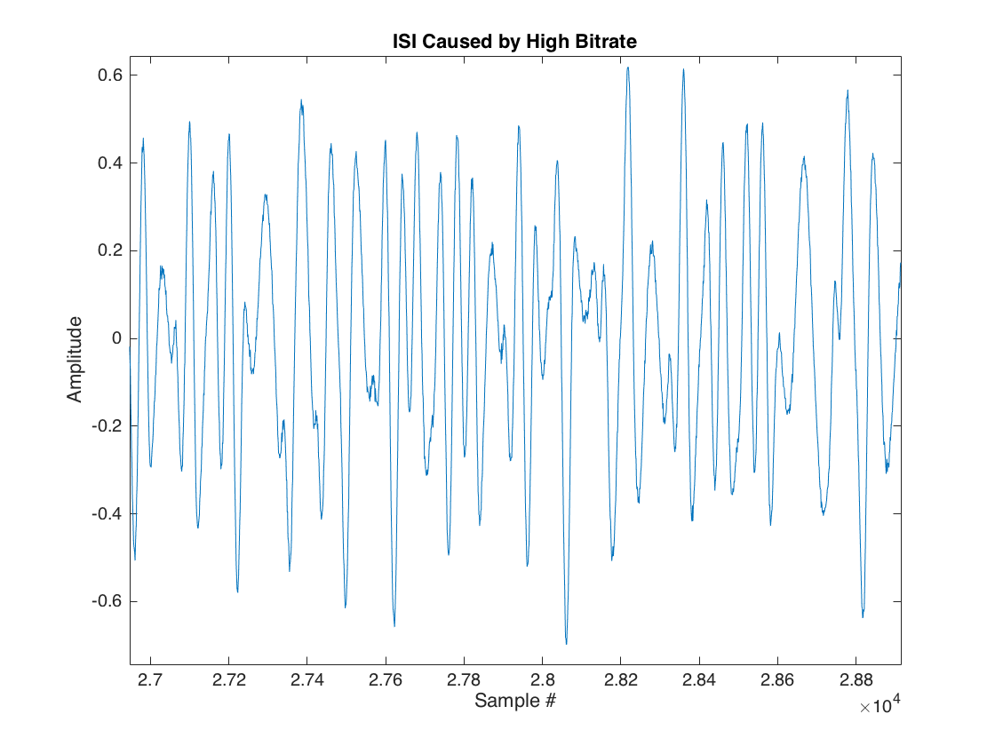Realizing this information, we found that the maximum bit rate we could achieve centered at 1600 Hz was 551.25 Bits per second, which seemed to be limited by intersymbol interference (ISI). A plot of a simulated transmission showing ISI is shown below.