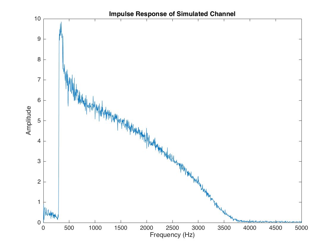 The mathematical definition of MSK is shown above, which specifices a center frequency (first term inside cos()), and has a variable frequency term that moves the waveform either a quarter above or below the center depending on the current bit. This is all continuously phase matched by the term phi, which either is zero or pi depending on whether the signal is transitioning from 1 to 0 or 0 to 1. We initially wanted to have a data rate of 9600 bits per second, but upon realizing our channel bandwidth, we had to lower this dramatically. The simulated channel that was measured consisted of a laptop running MATLAB at the center that would modulate data, play the resulting vector over a USB soundcard to one radio which would be recieved by the second radio outputting into another soundcard on the same computer. This data was recorded in Audacity and reprocessed in MATLAB separately. Measuring the impulse response of the simulated channel (PCs instead of PIC32s), which we assumed to be similar in bandwidth to the final system, we found that our usable bandwidth was roughly 3 kHz. Since this was the ideal case with very high SNR, we had to lower our bit rate to acheive a functional system.