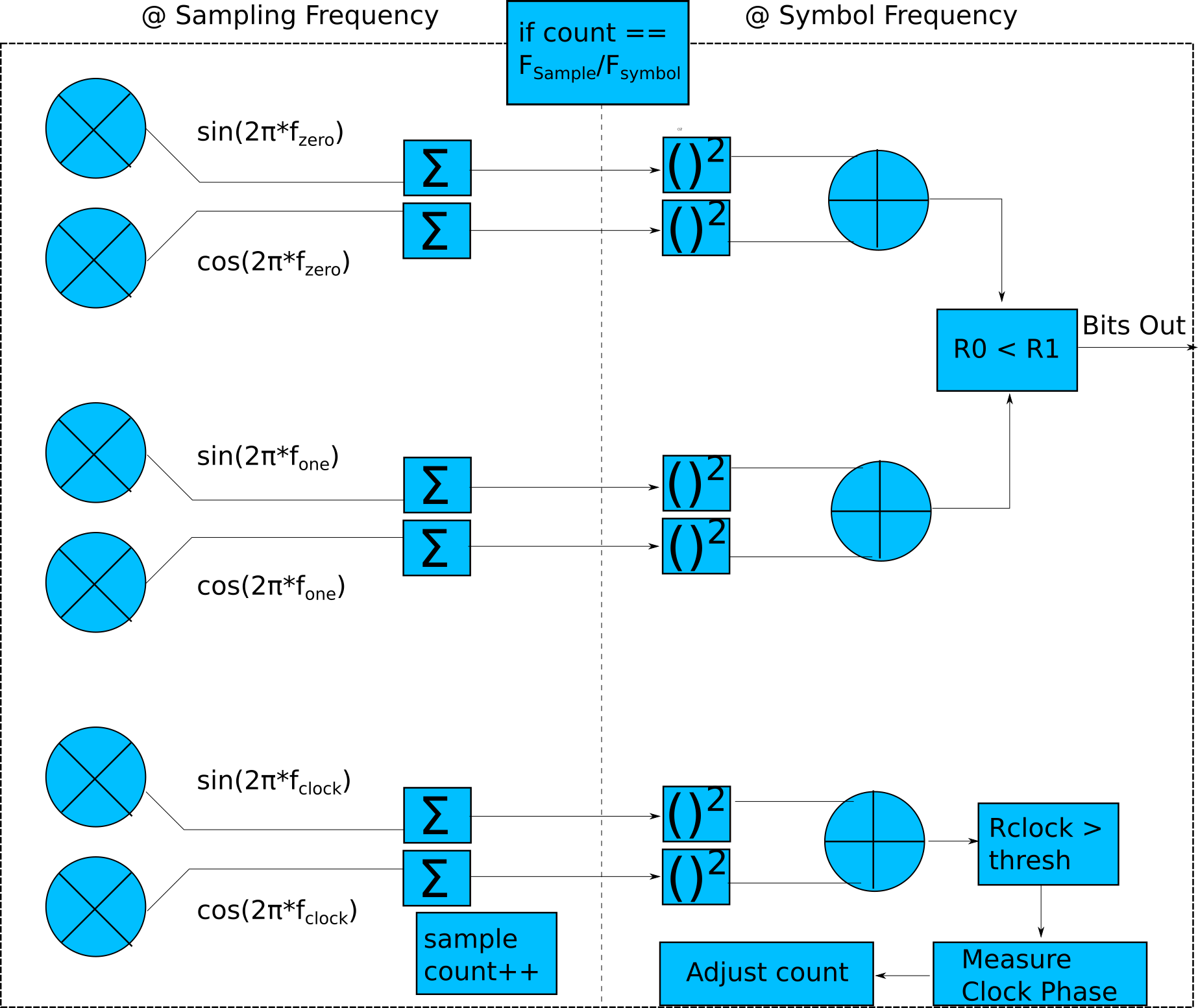 On average, transmissions were decoded correctly about 50-60% of the time if short in length. The input tested was 'ECE 4760'. Longer inputs fared poorly, being decoded only 10-20% of the time. These inputs were anywhere from 35-150 characters long, or 280-1,200 bits. This can almost certainly be attributed to clock synchronization, which plagued our simulations since the beginning of the project. Below is the final block diagram of and demodulator.