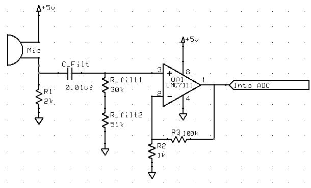 We chose this value from the given that the outlet AC alternates at 60Hz, and this is the prominent noise source. Then we passed the filtered signal through an LMC7111, to amplify the signal. We played around with the gain value, and found that a gain of approximately 100 (101 to be exact) is useful for our cause. Although the microphone signal is still not as high for external sound, we cannot make the gain too high, since there is a limit with the frequency cut off and gain. The gain, is simply 1+R3/R2, which is 1+(100kΩ/1kΩ) = 101. This enters the ADC converter.