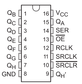 The 74hc595 we use is in 16-pin PDIP package as shown to the left.