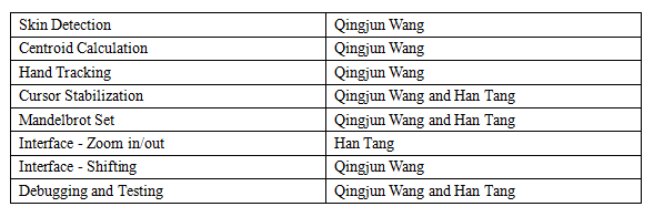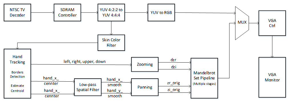 We added a skin detection filter in the YCrCb module to filtered out all colors except the skin color. The low pass filter were used to get a smooth centroid point . The Mandelbrot Set module using multi-pipelines which updated VGA display in real time was controlled by the hand tracking module.