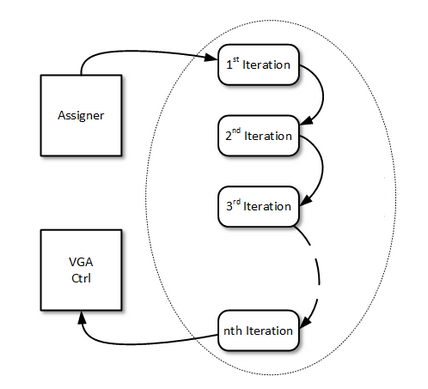 The advantage for this method is that we could make sure the time for one whole screen calculation was one VGA frame time exactly, no matter what the zoom level. To make sure of this, the time for one pixel calculation could never longer than 40 ns, which is the VGA scanning time for one pixel (under 640 by 480 resolution). This also set the limit for the number of pipelines.