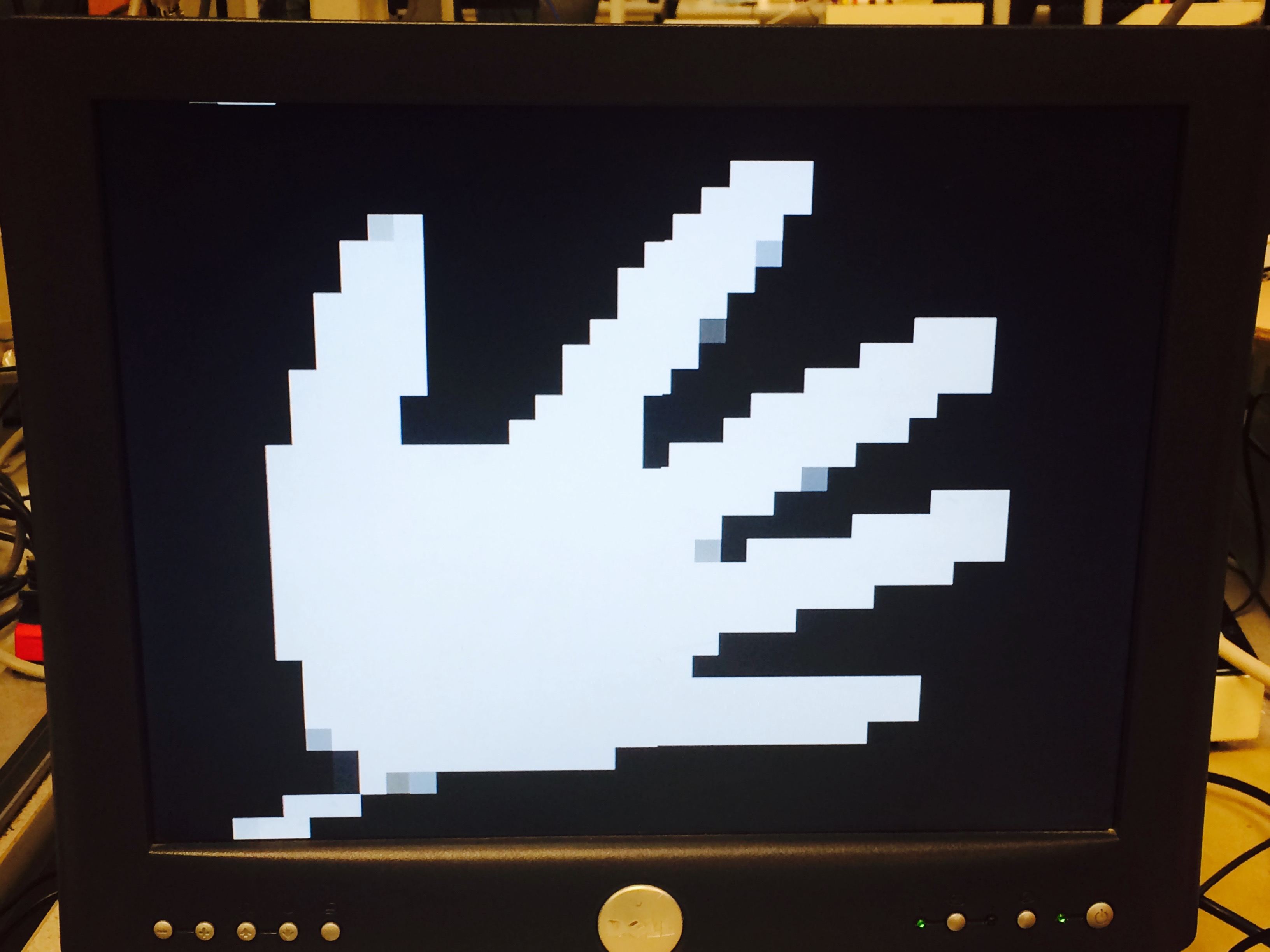 On the top module three switches control what is displayed on the VGA screen. The first mode is to display the down sampled skin color image, with detected skin color displayed in white blocks while black for the rest of the area. This mode could help us first check the lighting conditions for the hand tracking. We want to make sure the skin color could be correctly detected before moving to the next steps.