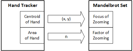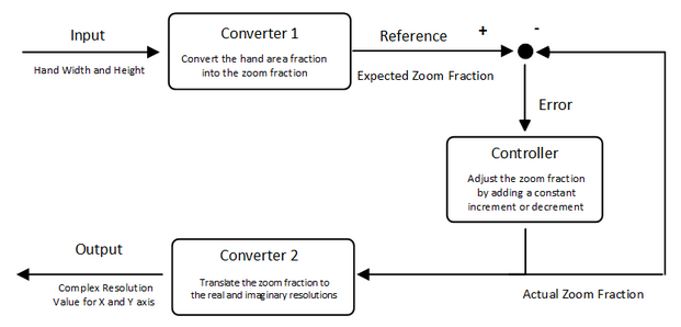 The zooming effect is realized by adjusting the resolution of real and imaginary step for each pixel on the Mandelbrot Set. In order to present a zoom-in effect, the difference between each pixel should become smaller as one’s hand approaches closer to the video camera; and vise versa. We introduced a zooming factor to quantitatively describe the resolution which determines both real and imaginary step for pixels in the Mandelbrot Set in roughly a linear relation. This conversion is done by the Converter 2 in the zooming module (see Figure ).