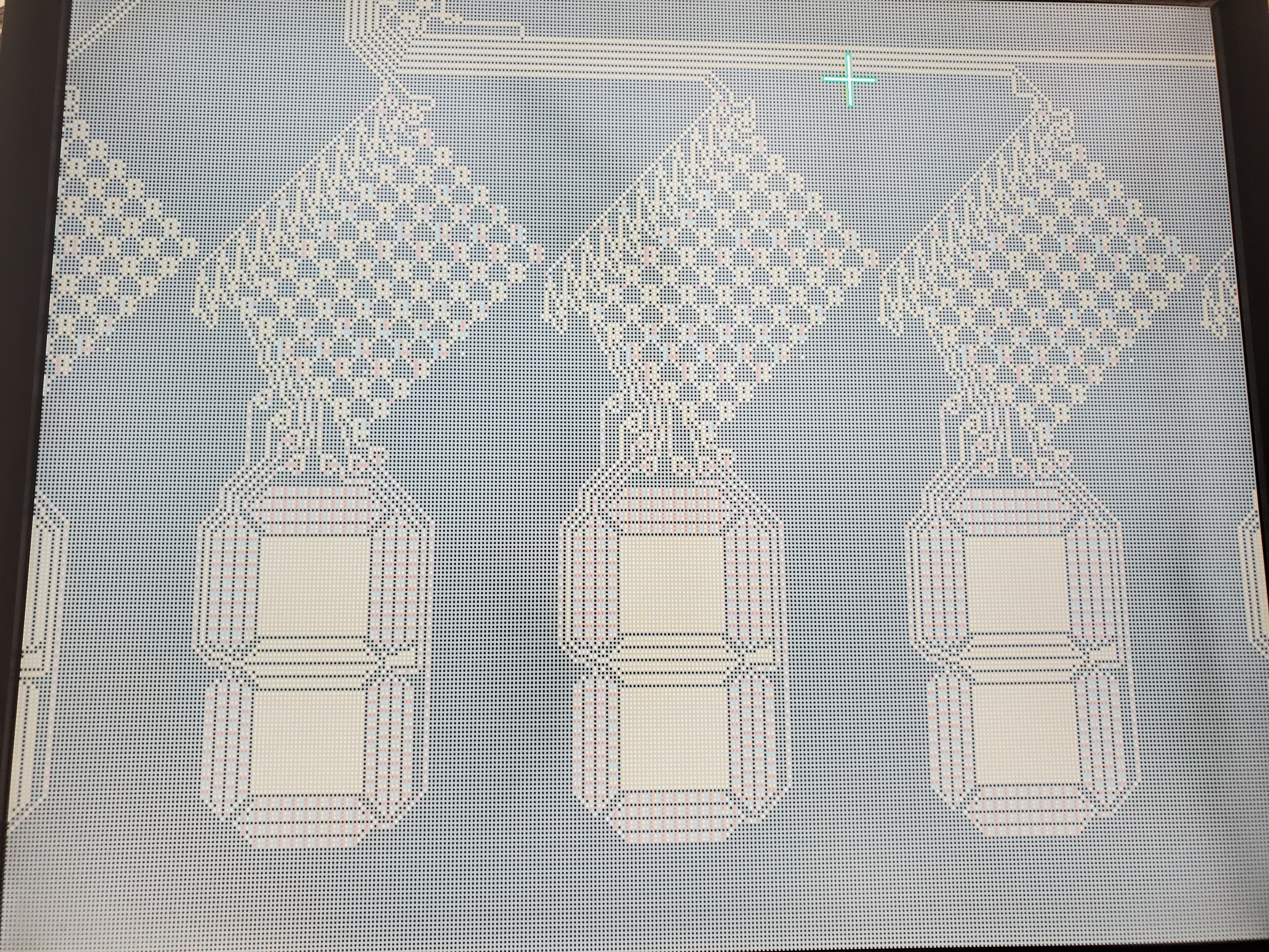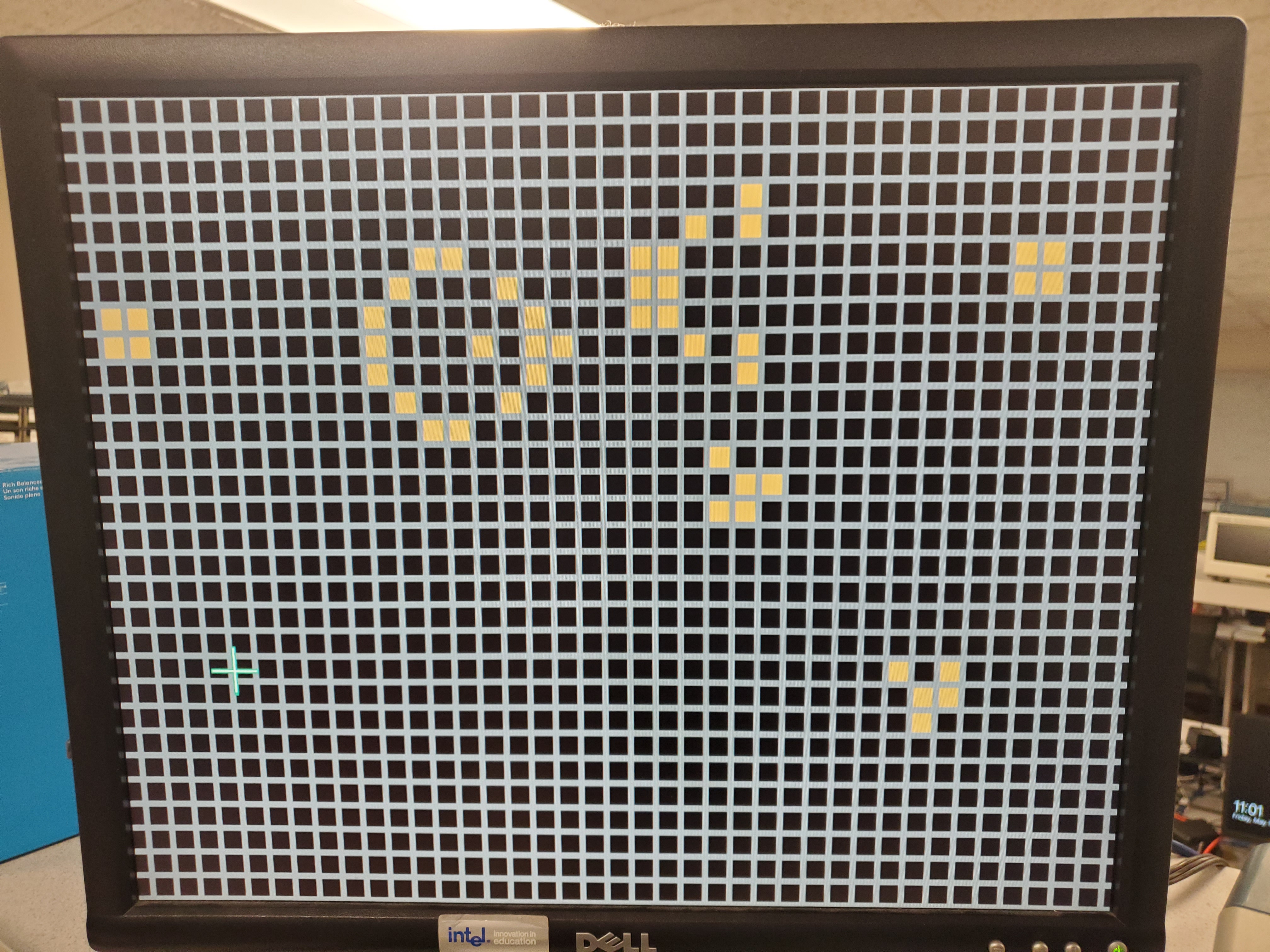 This image shows the Processor after running a few cycles of Game of Life. A video of this design updating and transforming is in the Demo on the introduction page. Overall, switching from Wireworld to Conway's Game of Life operated as expected. On the flip of a switch, the FPGA seemlessly switched rules, and had no visual nor comuputational glitches associated with it.
